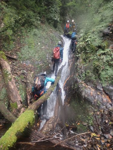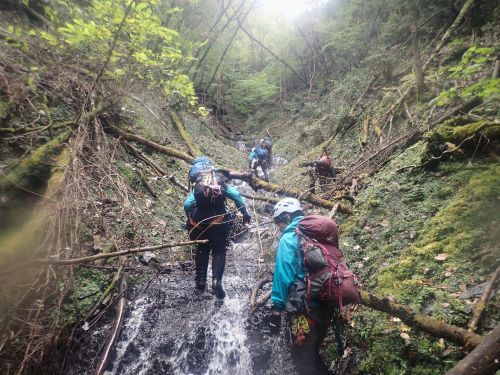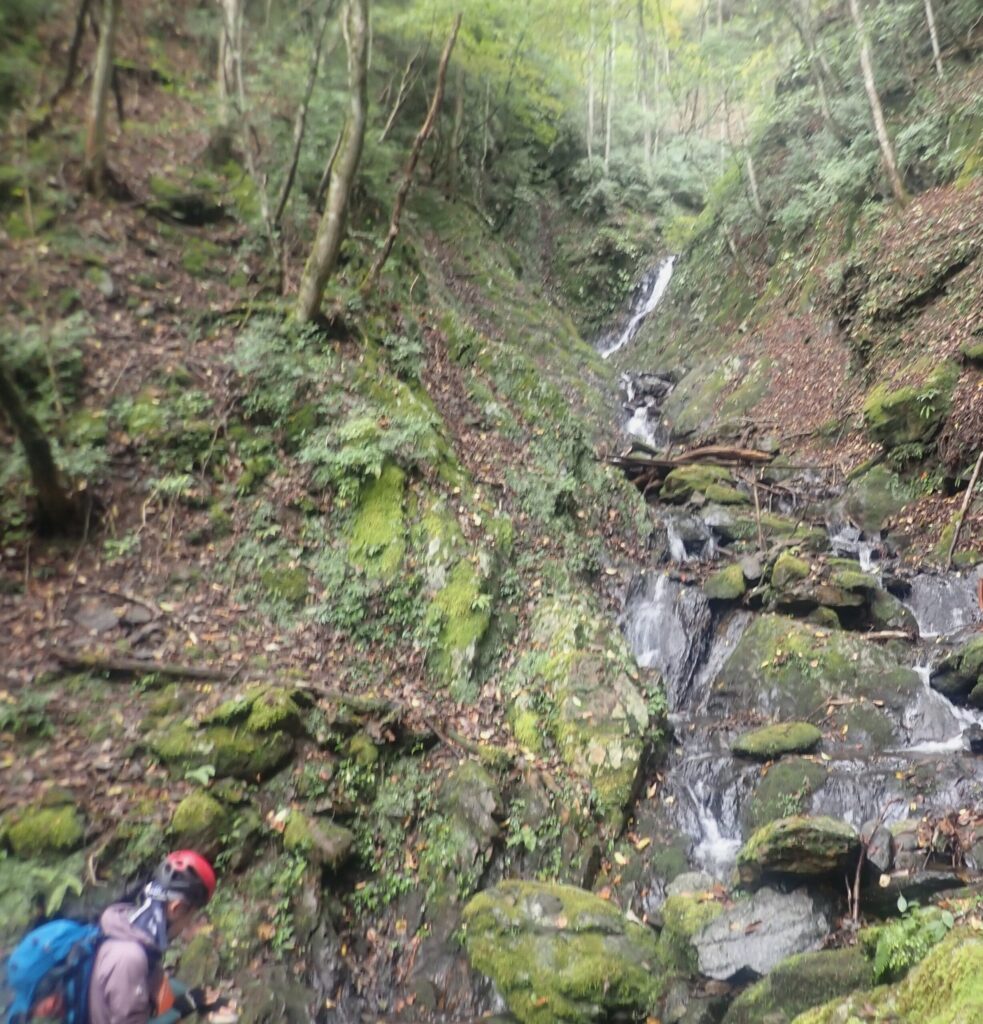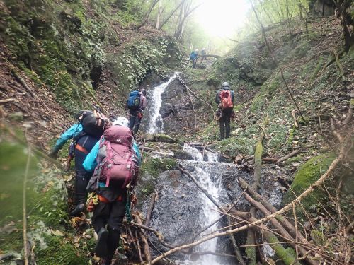 シンナシ沢は小金沢本谷右岸の沢で最初に入る沢だ。塾では2022年に左俣を2023年に右俣を遡行しているが、今回は、以前遡行して面白かった右俣を遡行するが、ほとんど入渓者がいないので岩が脆く、ハーケンの効きも甘い。左沢は入渓後すぐに出てくる沢以外滝といえる滝はない。
