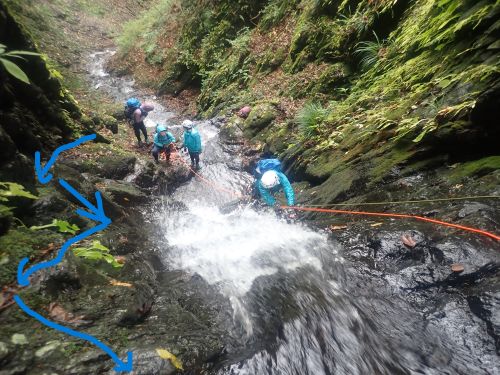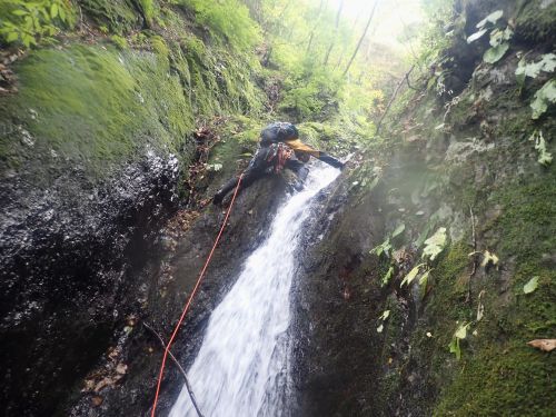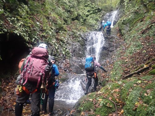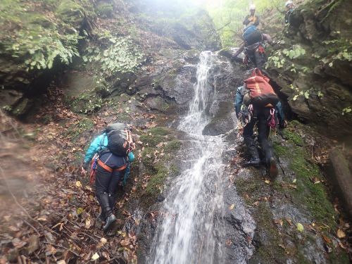 3連の滝、最後の滝の登攀が難しく、この沢遡行のポイントとなる。巻く場合は、二俣まで戻って大高巻きとなる。