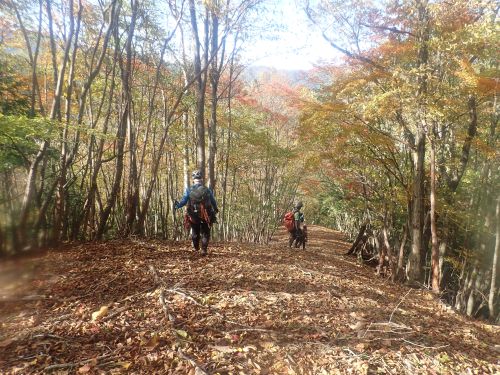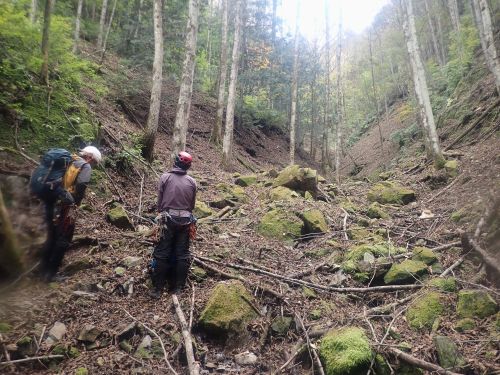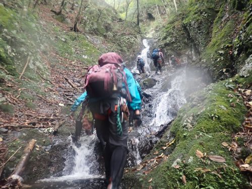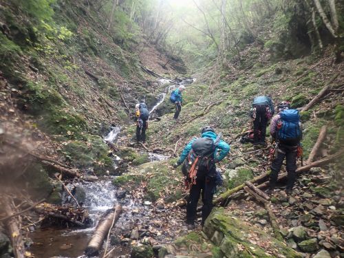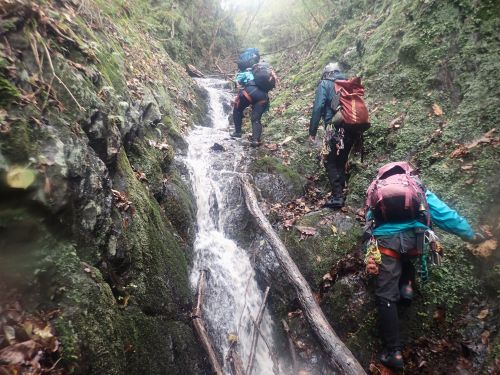 Co1060付近の滝を登ると水も枯れ、枯れ沢となるので右岸のシンナシ尾根に上がり、左沢にいったん下り、Co1100付近から大峰からの山道に出る